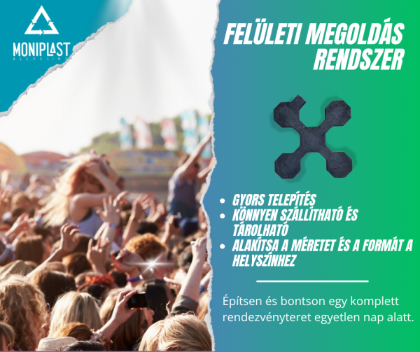 A Moniplast újrahasznosított műanyagból készült felületi megoldás rendszere ideális választás szabadtéri rendezvényekhez, fesztiválokhoz, vásárokhoz, logisztikai bázisokhoz és építési területekhez. Moduláris kialakításának köszönhetően könnyen szállítható, gyorsan telepíthető, és az aktuális helyszín adottságaihoz rugalmasan igazítható.